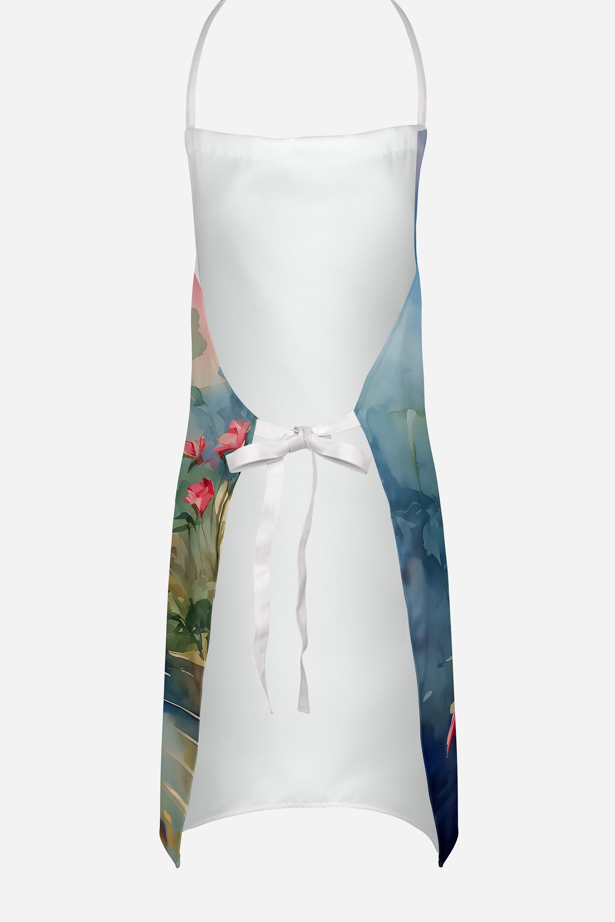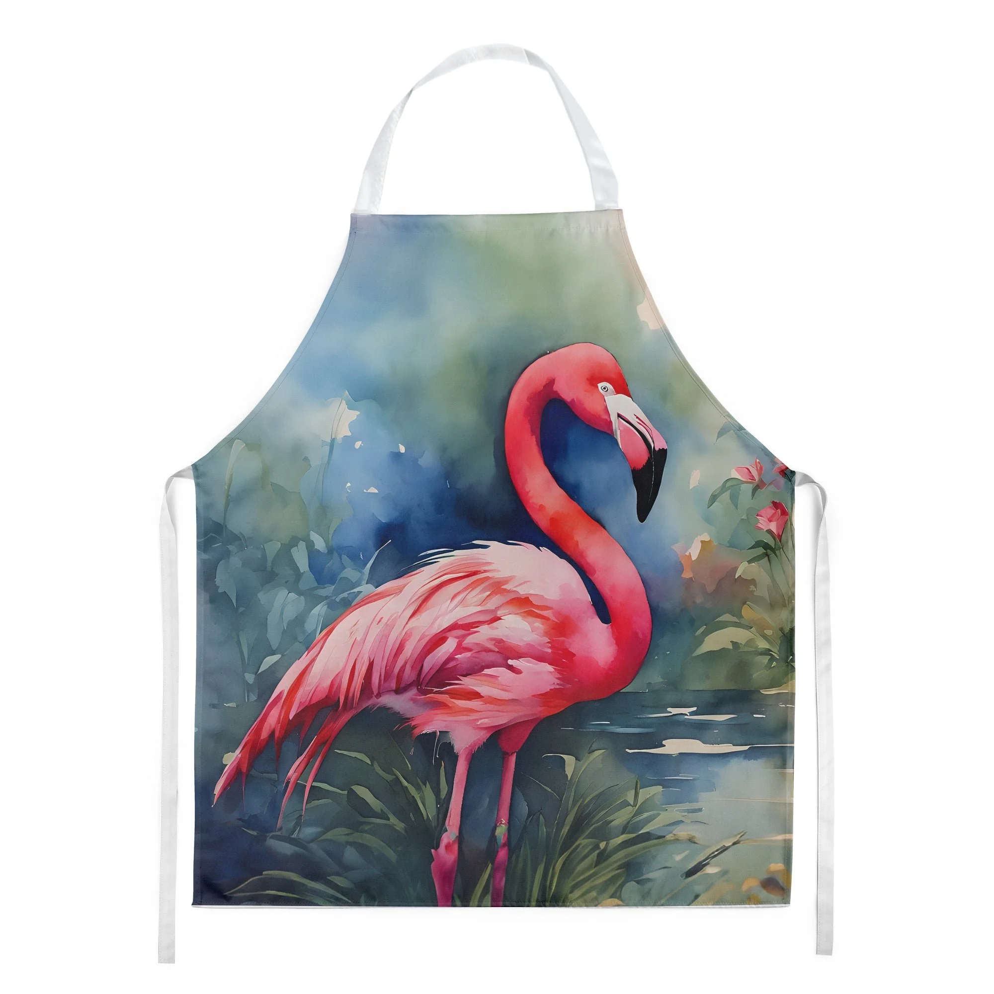 Apron featuring breed specific Flamingo artwork. Elevate your cooking, baking, and grilling experiences with our versatile Kitchen or BBQ Apron. This Bib Style apron isn't just limited to culinary activities - it also serves as an excellent baking apron, artist apron, server apron, gardening apron, or even a dog grooming apron. The apron showcases vibrant full-color artwork contributed by one of our talented artists, bringing a dash of style to your daily tasks. With dimensions of approximately 27"W x 30"H, it provides ample coverage to protect your clothing from spills and splashes. Our apron is meticulously crafted from 100% Ultra Spun Polyester, known for its durability and lightweight nature. The apron comes with white tie straps, ensuring a comfortable and adjustable fit for all. It's a perfect choice for kitchen apron enthusiasts, whether you are a woman or a man. Designed for easy maintenance, this apron is fully machine washable. The quick-drying polyester material actively reduces staining, keeping your apron looking fresh and new for longer. Our beautifully designed apron isn't just a functional kitchen accessory - it's a fashion statement in the culinary world!